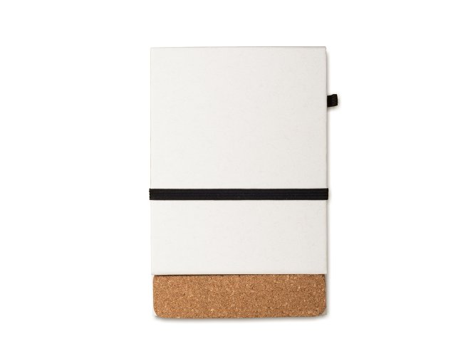 Mini caderno produzido com papel de caixa de leite com capa dura, com 80 folhas, com papel em 80 (g/m2). Com cortiça na parte inferior, elástico na cor preta e porta caneta.