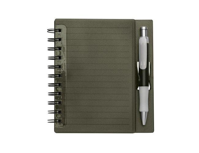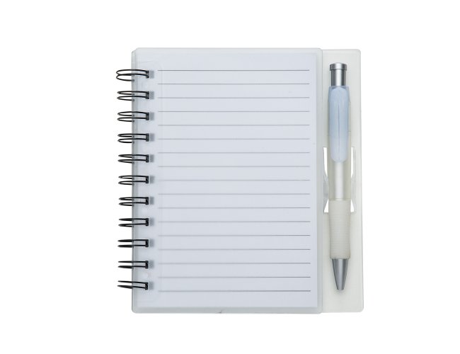 Caderno plástico wire-o com caneta e suporte para encaixe. Caneta plástica com detalhe emborrachado, carga esferográfica na cor azul e acionamento por clique.