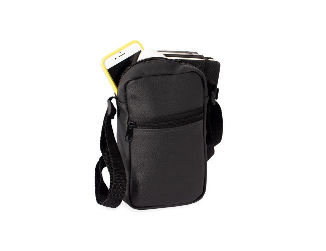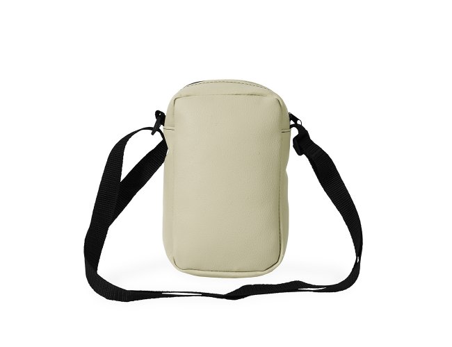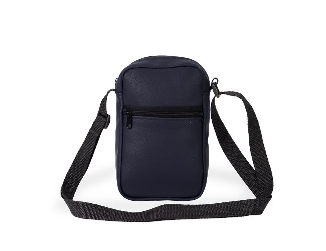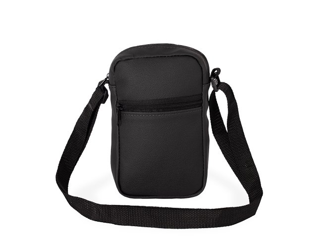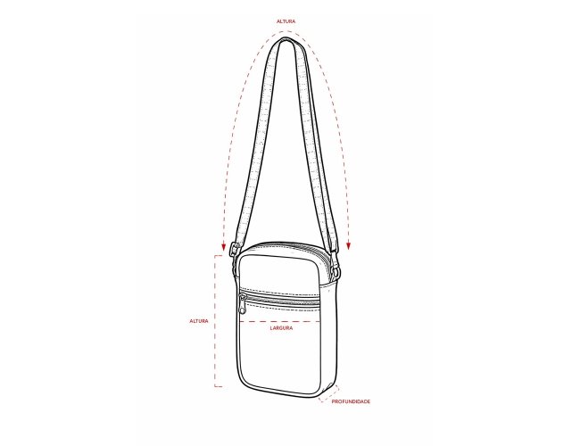 Bolsa de ombro confeccionada em couro sintético com fechamento em zíper e alça ajustável. Possui dois compartimentos: um com bolso aberto em tecido de malha e outro localizado na parte frontal.