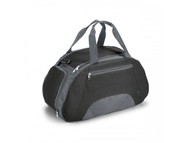 Bolsa esportiva em 600D com fundo em placa semi-rígida. Bolso frontal e bolso lateral para calçado, ambos com zíper. Alça de ombro ajustável. Capacidade até 30 L. 520 x 300 x 255 mm