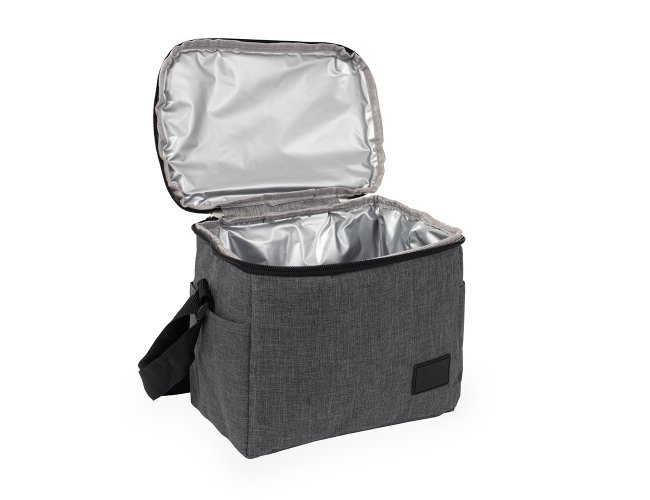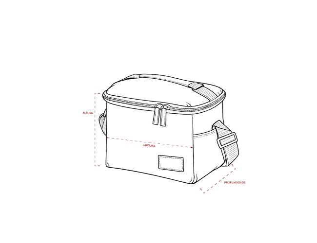Bolsa térmica confeccionada em Oxford 300D resistente à água com capacidade máxima de 6 litros, fechamento em zíper e plaquinha personalizável em plástico costurada na parte frontal. Possui revestimento térmico antivazamento em PEVA, dois bolsos laterais, alça de mão superior e alça transversal ajustável.