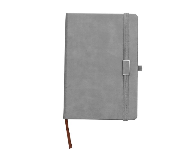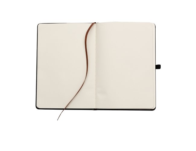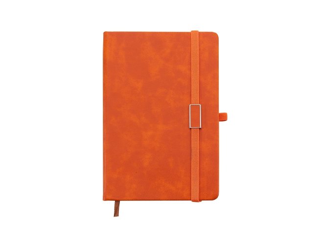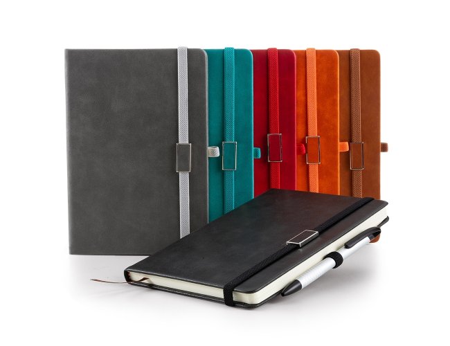 Caderneta emborrachada com suporte para caneta. Contém aproximadamente 96 folhas amarelas sem pauta, suporte de nylon para caneta (não acompanha), marcador de página em cetim e elástico para lacre com plaquinha de centro emborrachado.
