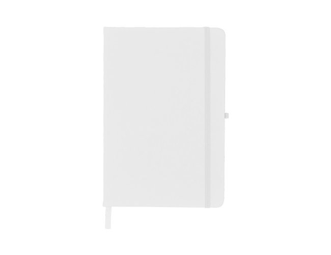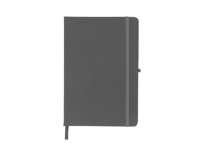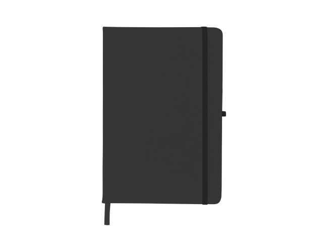 Caderneta emborrachada com porta caneta elástico em nylon, marcador de página em cetim e fita elástica de nylon para fechar. Contém aproximadamente 80 folhas pardas sem pauta.
