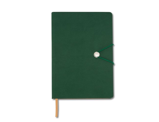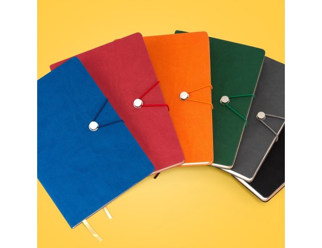 Caderneta com fecho de pino e elástico de nylon para lacre. Capa em material sintético emborrachado, possui aproximadamente 96 folhas pardas pautadas e marca página em cetim.