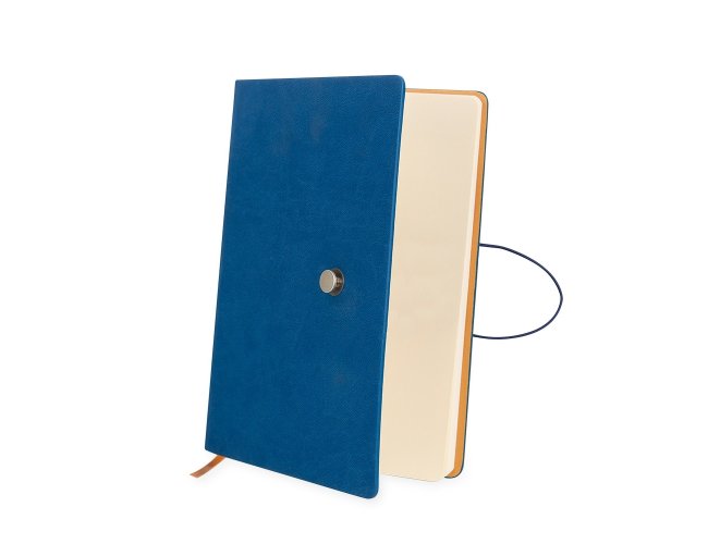 Caderneta com fecho de pino e elástico de nylon para lacre. Capa em material sintético emborrachado, possui aproximadamente 96 folhas pardas pautadas e marca página em cetim.