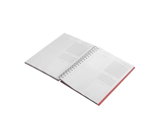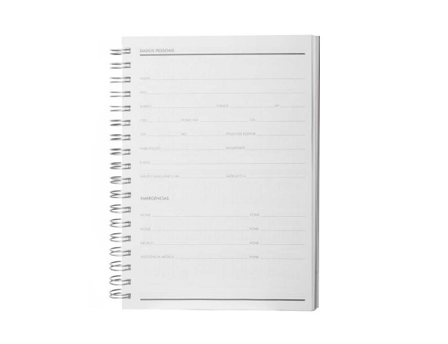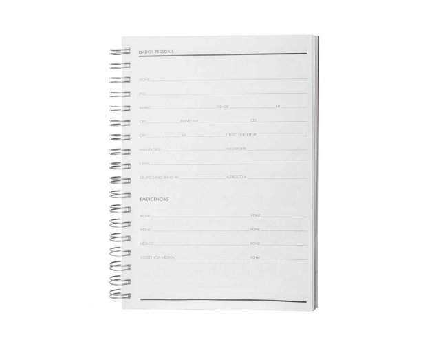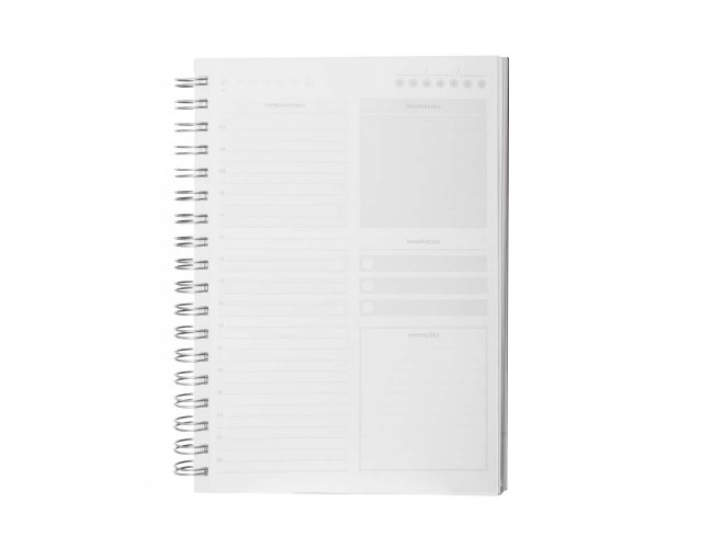 Caderno planner com capa rígida em Percalux de 2mm em formato espiral. Contém 90 folhas brancas de 95g/m². Folhas estruturadas em formato de planner para anotações e gestão da rotina.