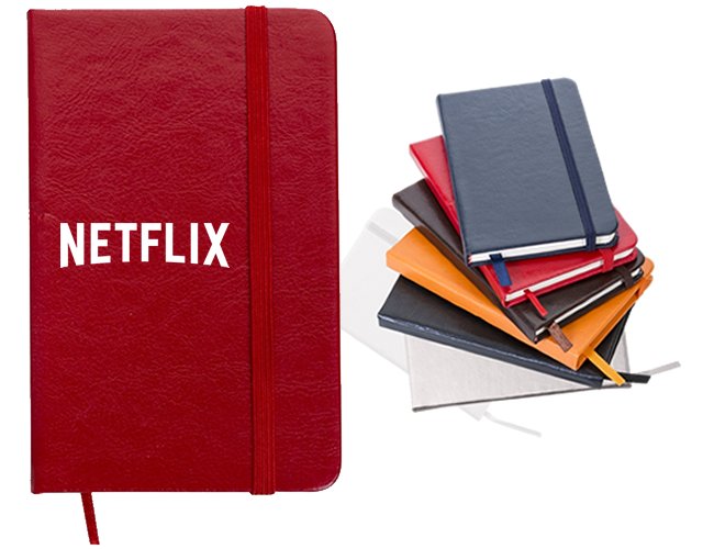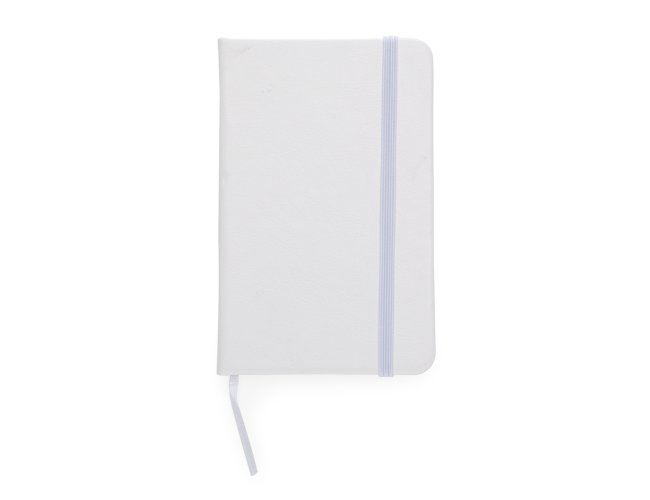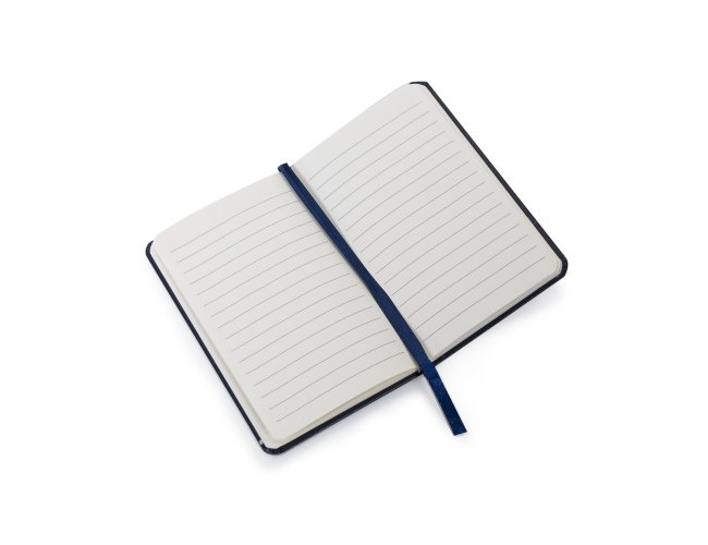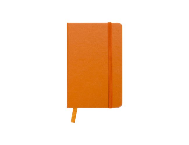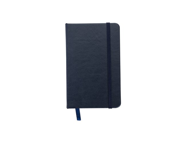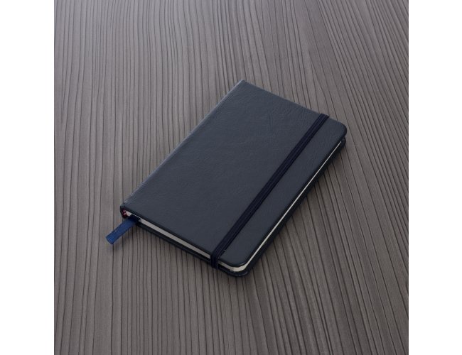 Caderneta de couro sintético com elástico para lacre e marcador de página em cetim, contém 80 folhas pautadas.