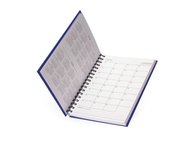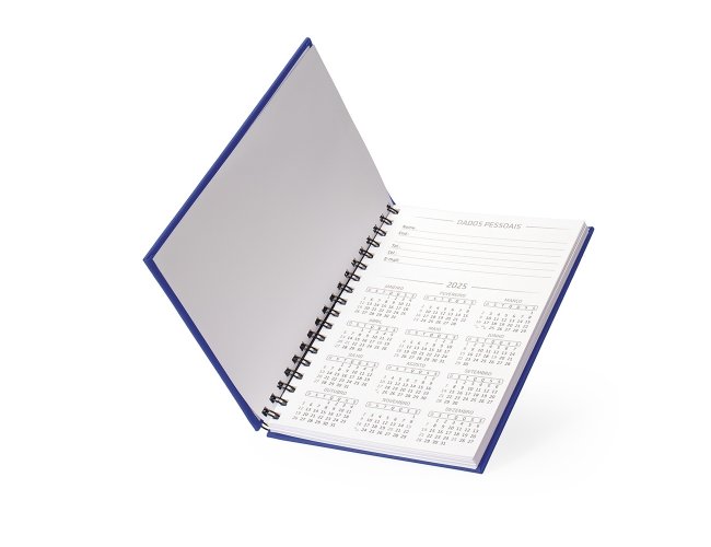 Caderno emborrachado de frente e verso lisa com espiral preto. Possui dados pessoais, calendário de 2025 à 2027, aproximadamente 100 folhas brancas pautadas com detalhe "data" na parte superior de cada folha.