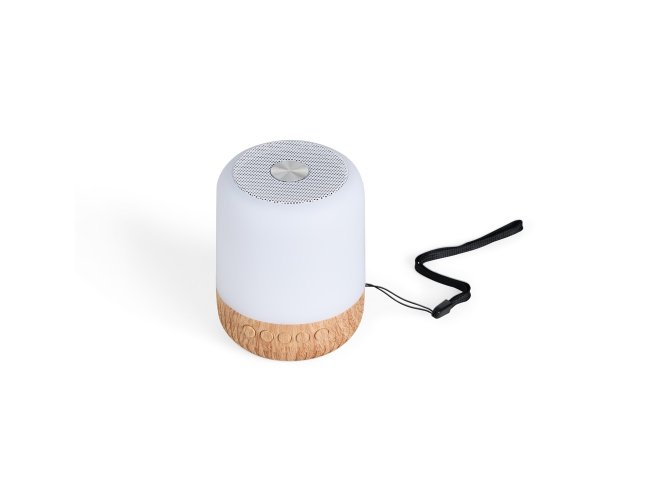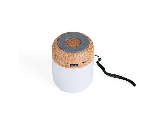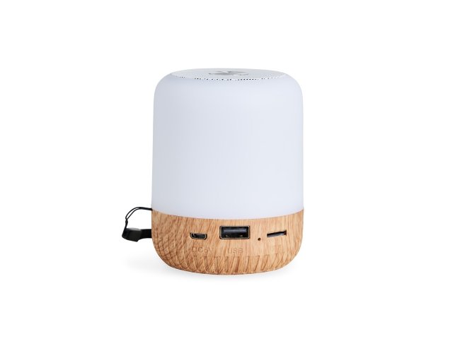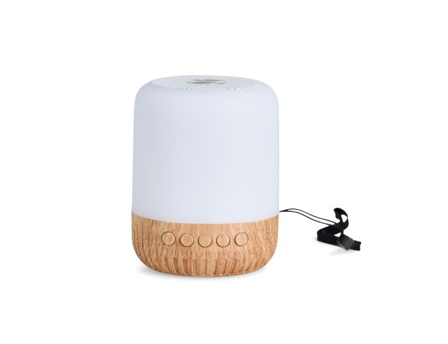 Caixa de som multimídia sem fio em plástico com detalhes que remetem à textura de madeira e um anel antiderrapante colado à base. Conta com iluminação em LED e painel de botões para alternância entre os modos Bluetooth, rádio FM e reprodução de arquivos MP3 a partir das entradas para cartão TF (microSD) e USB para pen drives. Acompanha cabo micro-USB para carregamento.