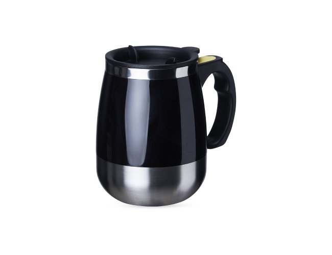 Caneca isotérmica com misturador de bebida, parte interna feita em inox parede dupla com capacidade de 350ml, acabamento colorido em plástico. Contém tampa plástica com bocal e trava de segurança. Para o funcionamento, utiliza-se duas pilhas AAA (não acompanha).