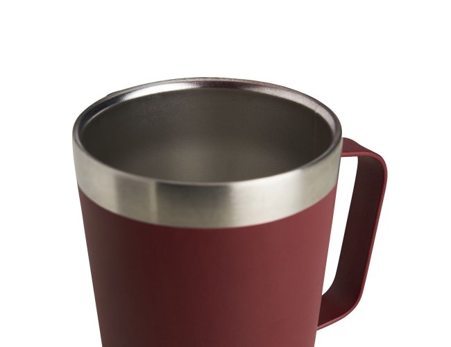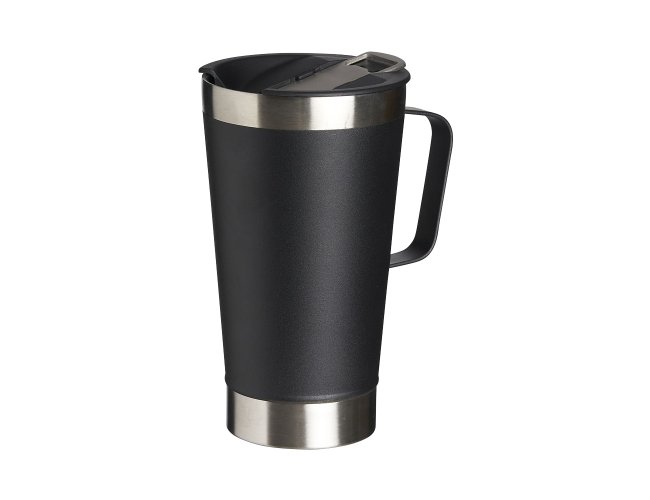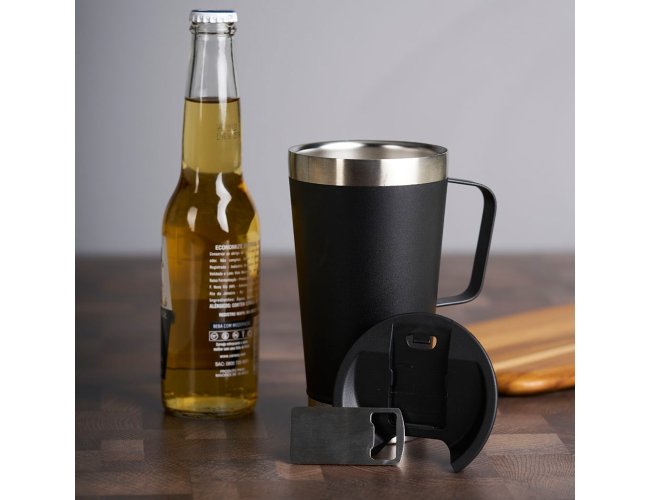 Caneca térmica de inox com capacidade para 500ml. Acompanha uma tampa de plástico e um abridor de garrafas. O abridor fica preso em um encaixe existente na tampa, porém é removível.