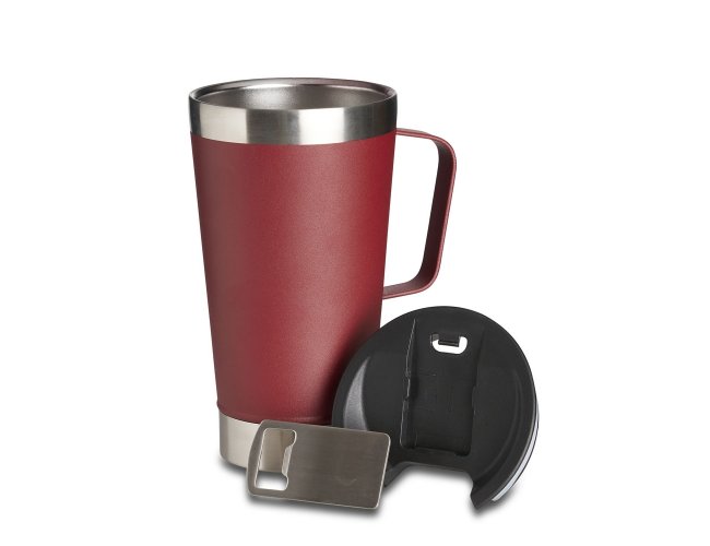 Caneca térmica de inox com capacidade para 500ml. Acompanha uma tampa de plástico e um abridor de garrafas. O abridor fica preso em um encaixe existente na tampa, porém é removível.