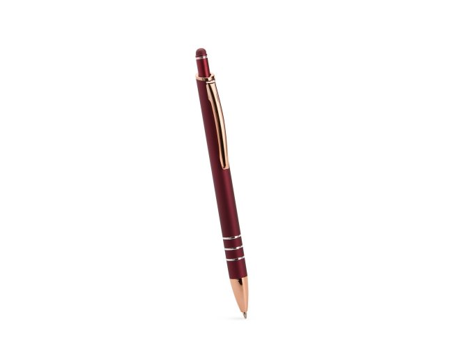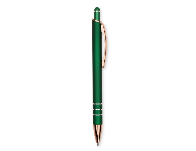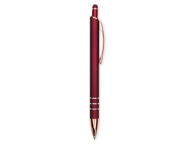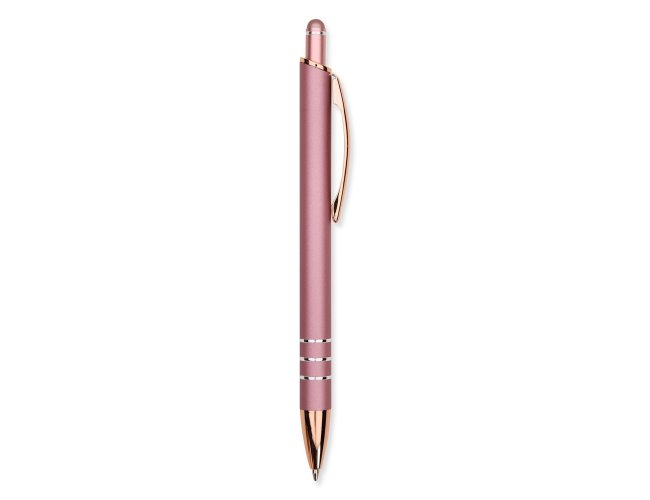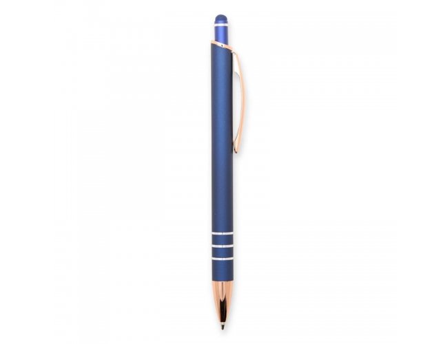 Caneta metálica com carga esferográfica de 1,0mm e acionamento por clique de revestimento emborrachado, ideal para interagir com telas sensíveis ao toque.