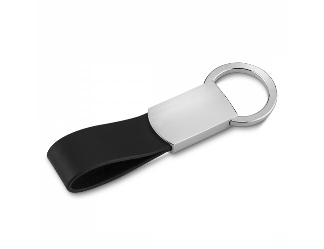 Chaveiro de metal fosco com alça em couro sintético preto + caixa com berço aveludado