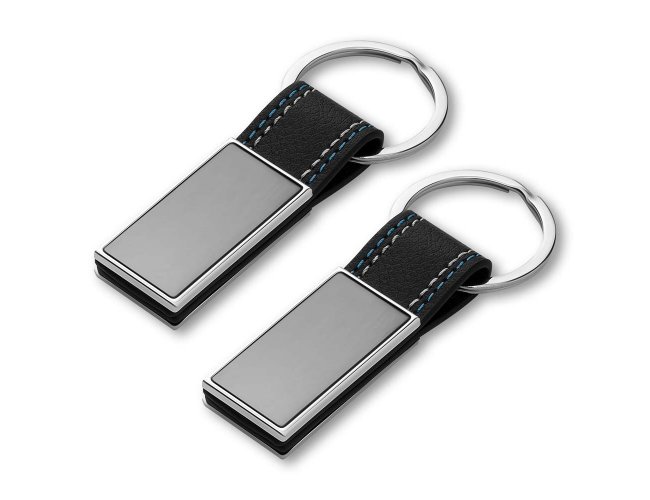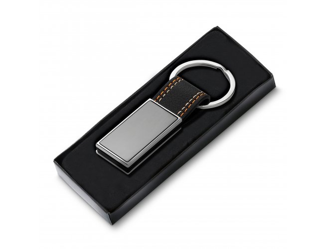 Chaveiro de metal em níquel brilhante + PU, acompanha caixa com berço aveludado.