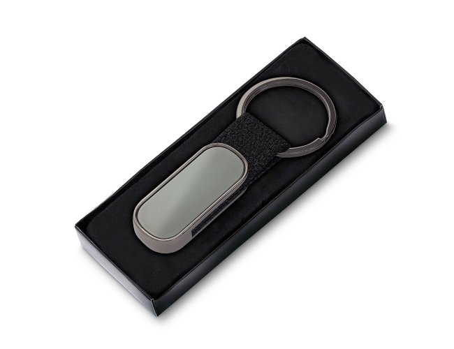 Chaveiro produzido em liga de zinco, ferro e poliéster.