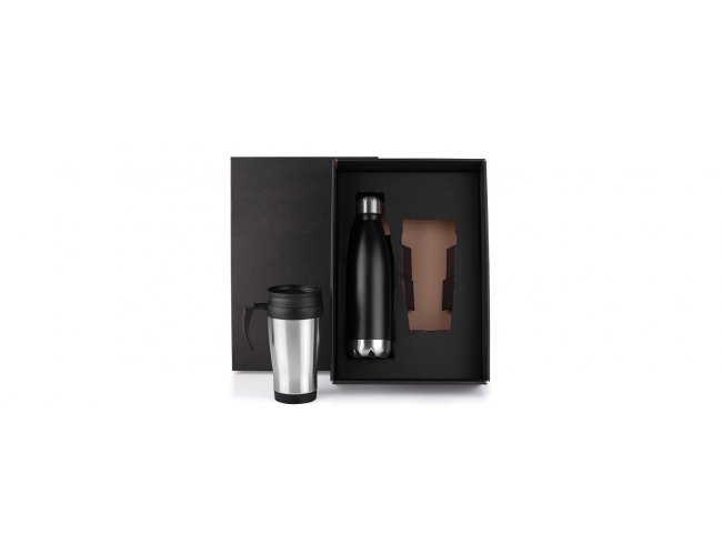 Kit composto por garrafa em aço Inox preta com capacidade de 750ml e tampa rosqueável, conta também com caneca em polipropileno preto revestida em aço inox escovado.