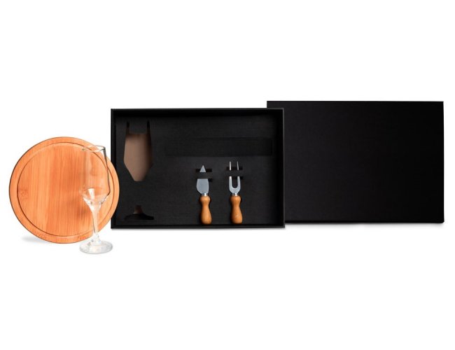 Composto por tábua para frios em Bambu; taça de vidro para champagne e conjunto de duas peças para Queijo em Madeira/Inox.