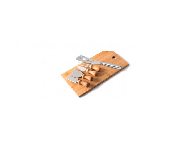 Conjunto para queijo em bambu/aço inox. Conta com tábua em bambu; Duas facas, sendo, uma com ponta e outra reta, garfo e espátula em madeira/inox; Faca para frios em metal. Acompanha embalagem kraft