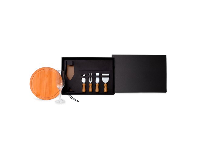 Conta com tábua em Bambu; Duas facas, uma espátula e um garfo para Queijo em madeira/inox; Taça em vidro.