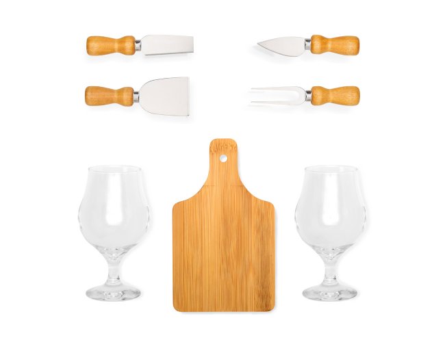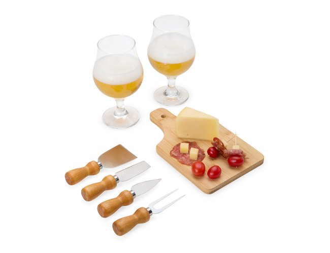 Conta com tábua em bambu; Duas facas, uma espátula e um garfo para queijo em madeira/inox; 2 taças para cerveja em vidro.