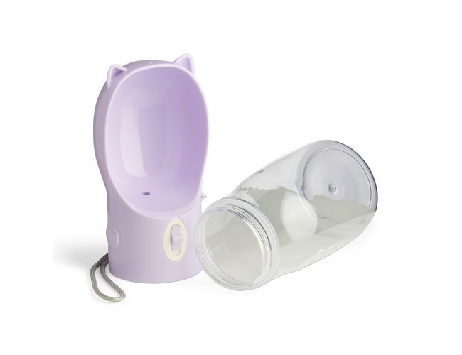 Garrafa bebedouro para pet feita em plástico com capacidade de 420ml. Basta acionar o botão para liberar o fluxo da água através da tigela. Acompanha alça de nylon para transporte.