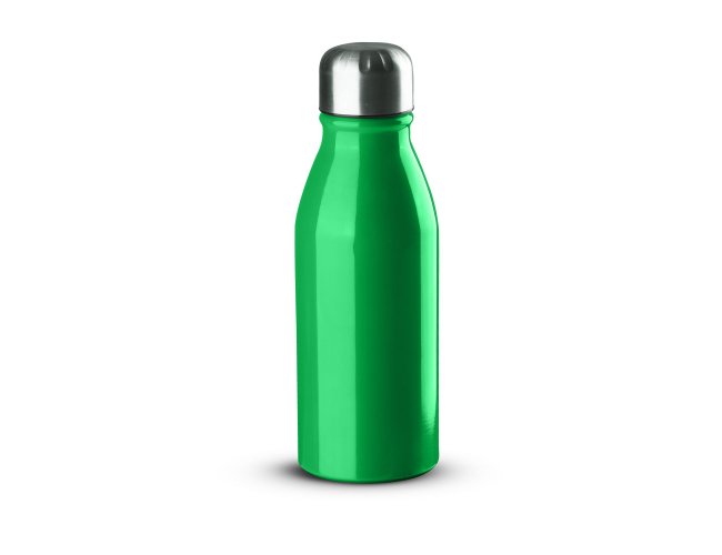 Garrafa em alumínio com capacidade 500ml. Tampa rosqueável em inox com anel de silicone.