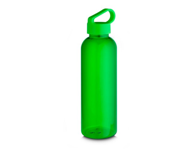 Garrafa *RPET com capacidade de 550ml. Tampa plástica rosqueável com alça de transporte integrada.
