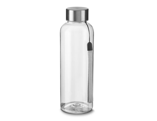 Garrafa *RPET com capacidade de até 600ml. Alça de transporte em cordão e tampa rosqueável de metal.