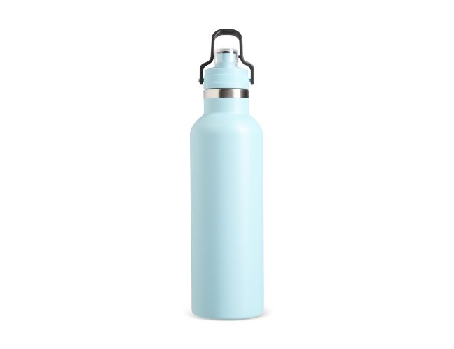 Garrafa térmica em inox 304 com capacidade de até 800ml. Possui estrutura de parede dupla e vedação a vácuo, permitindo conservar a temperatura de bebidas por mais tempo. Apresenta uma tampa rosqueável em plástico com protetor para o bocal e trava de segurança integrada à alça.