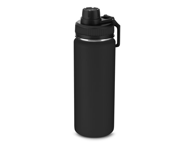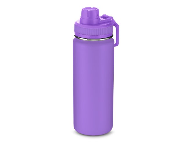 Garrafa térmica em aço inox com parede dupla com capacidade de até 570 ml. Tampa rosqueável, alça em plástico e anel de silicone para vedação. Design com frisos na tampa e pintura pó.