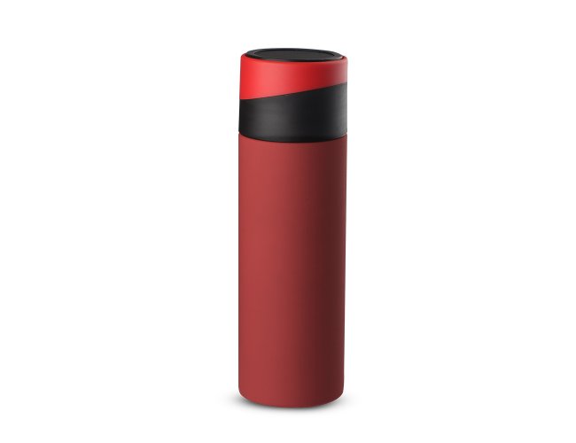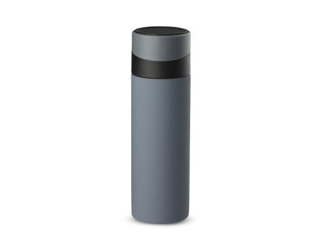 Garrafa térmica em aço inox com parede dupla isolada a vácuo, com capacidade de até 400 ml. Tampa rosqueável com anel de silicone para vedação. Com apoio de silicone para o celular na tampa.