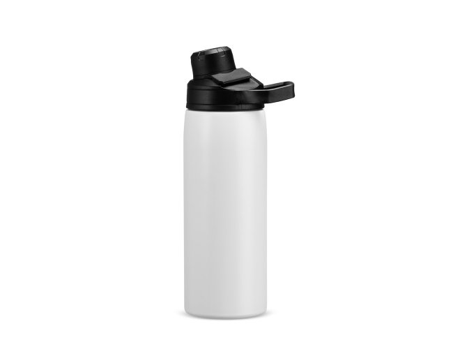 Garrafa térmica feita em inox com estrutura em parede dupla, vedação a vácuo e capacidade máxima de 600ml, ideal para manter a temperatura de líquidos por mais tempo. Possui tampa rosqueável em plástico resistente com protetor de bocal e alça fixa, em formato retangular, para transporte.