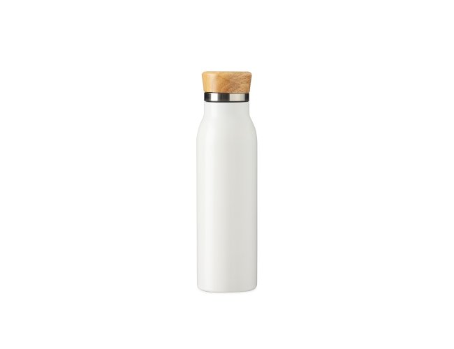 Garrafa térmica feita em inox com pintura em spray, tampa rosqueável em bambu e capacidade máxima de 600ml. Possui estrutura de parede dupla e isolamento a vácuo, permitindo manter a temperatura de líquidos por mais tempo.