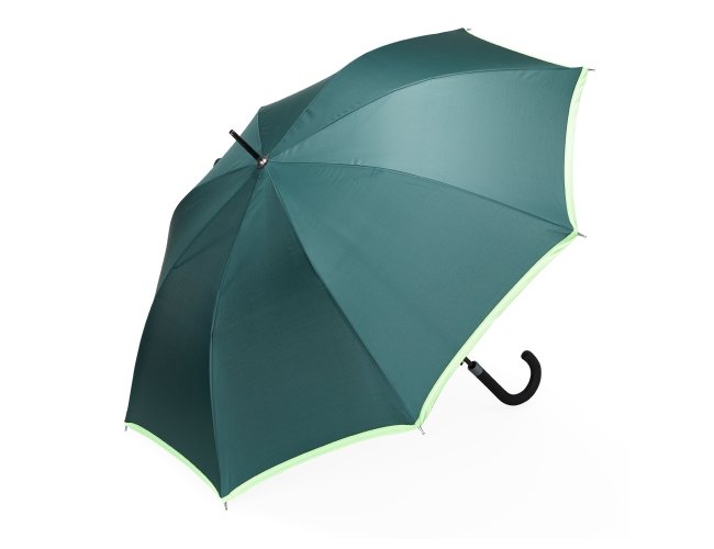 Guarda-chuva de poliéster de impacto impermeável com abertura automática, estrutura em aço e 8 varetas em fibra de vidro. Possui pegador plástico com botão de acionamento.