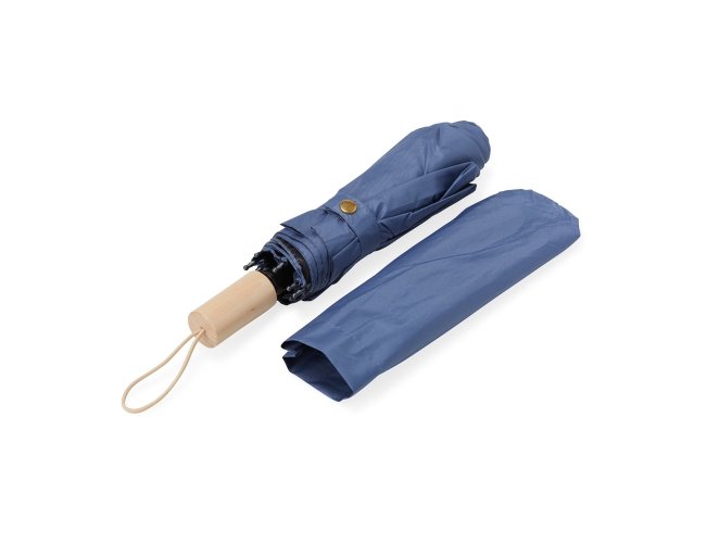 Guarda-chuva manual de nylon com proteção UV, tecido interno em vinil. Com 8 varetas e estrutura em aço, possui botão de abertura e pegador de madeira com alça de nylon. Acompanha capa protetora.