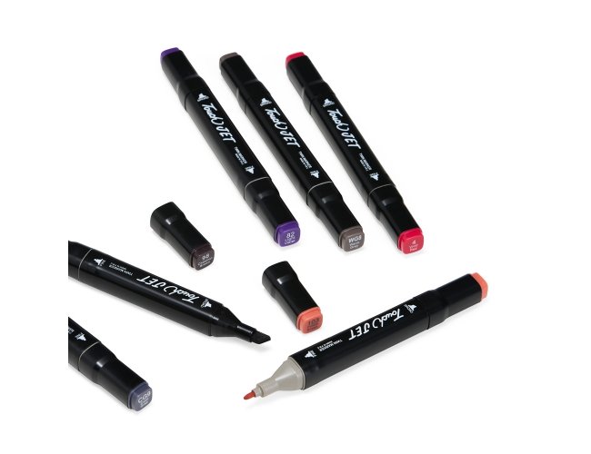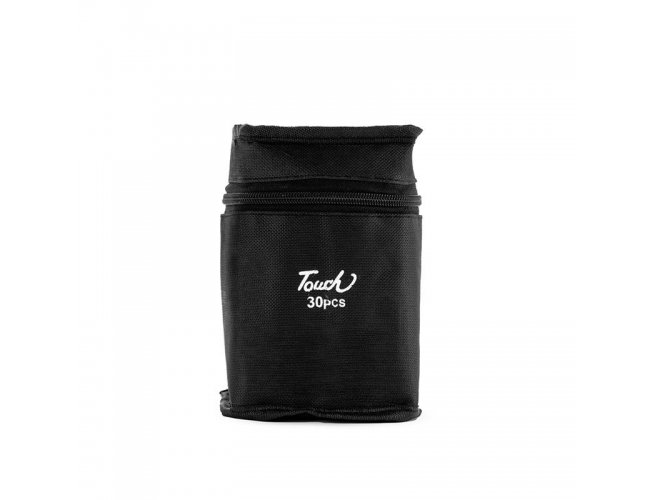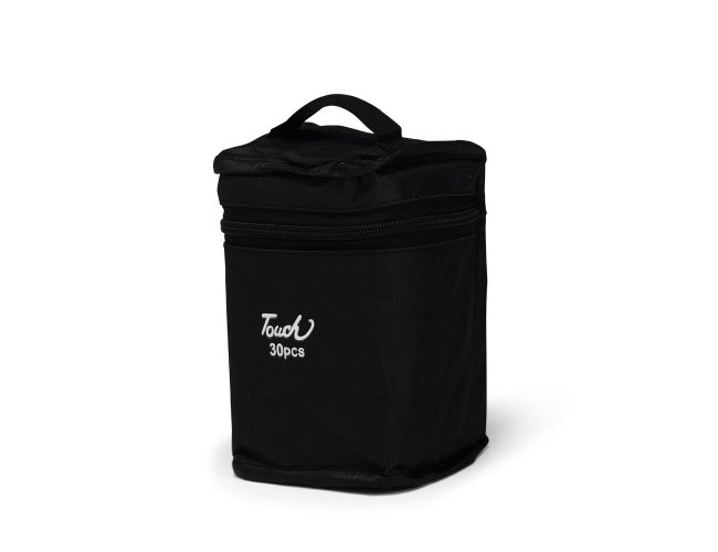 Kit com 30 canetas marcadoras feitas em plástico com pontas duplas: uma fina e outra chanfrada. Acompanham bolsa com alça e fechamento em zíper para transporte.