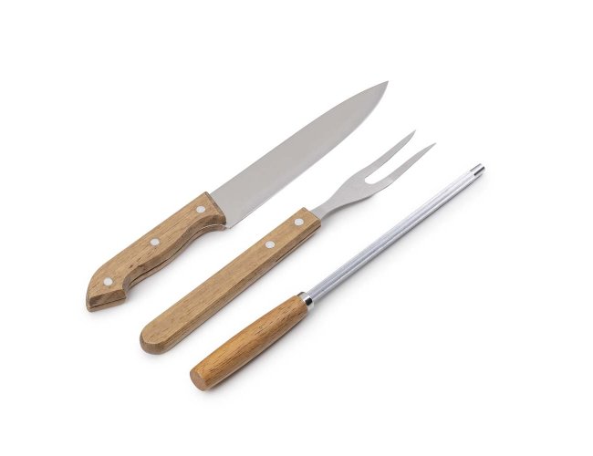 Kit churrasco com 4 peças: Garfo grande, Faca com 31,7 cm e uma Chaira, todos com cabos de madeira, ambos com cabos de madeira e lâminas em aço inox, e uma Tábua de bambu com 1,2 de espessura.