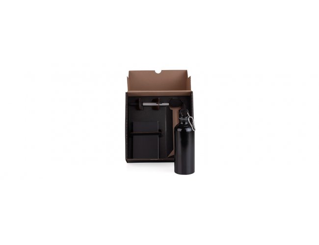 Kit squeeze, caneta e bloco. Composto por garrafa em alumínio de 500ml revestido com verniz; bloco para anotações preto e caneta esferográfica em ABS prata.