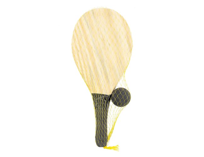 Kit frescobol com embalagem de malha plástica. Contém 2 raquetes de madeira com pegador de revestimento EVA e bolinha emborrachada.