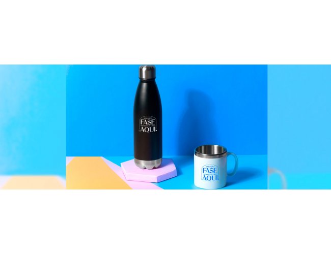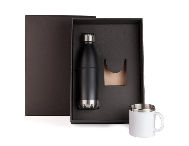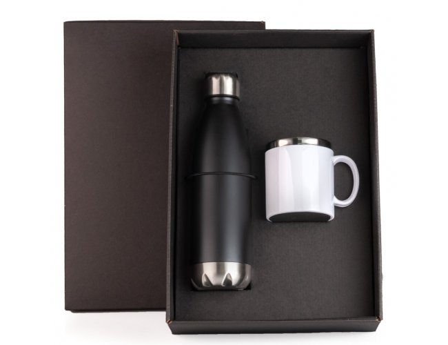 Kit garrafa e caneca. Composto por Garrafa em Aço Inox preta com tampa rosqueável e caneca confeccionada em aço inox escovado com acabamento externo em poliestireno branco.