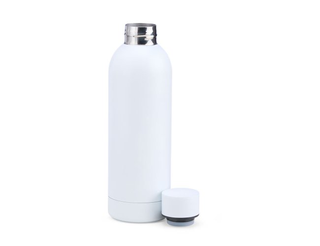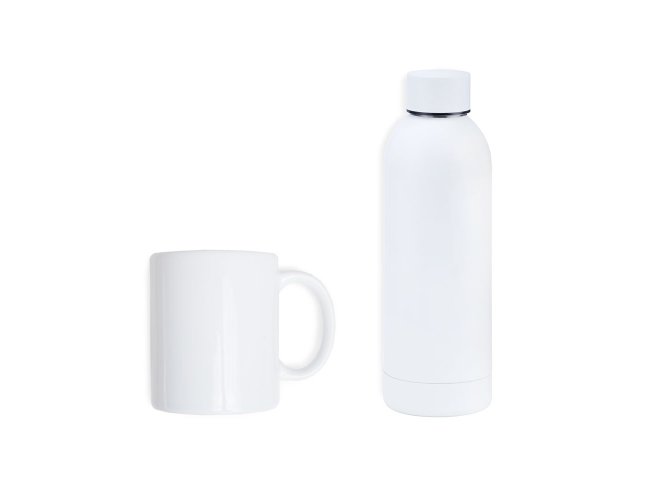 Composto por garrafa branca com parede dupla em aço Inox e caneca em cerâmica branca.