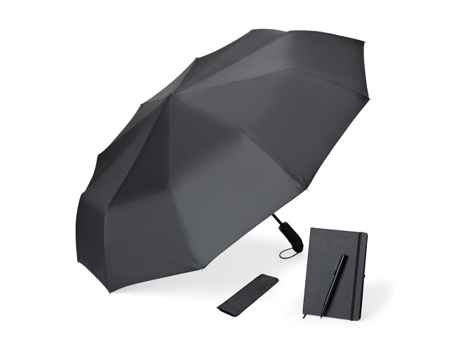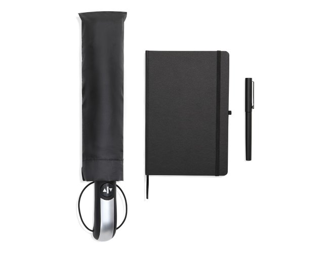 Kit guarda-chuva, caderno e caneta. Composto por guarda-chuva confeccionado em Nylon 190T na cor preta com ativação automática ao pressionar um botão, tanto para abrir quanto para fechar, empunhadura confortável com elástico para fixar no pulso, diminuindo o risco de queda e aumentando a segurança. Conta também com caderno para anotações preto com capa dura e caneta roller em alumínio com tampa preta.