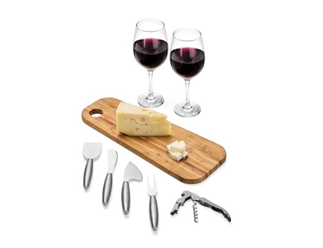 Composto por tábua em Bambu com 39x15x1,5 cm; duas taças de Vidro para Vinho; conjunto de facas em aço Inox para queijos e abridor saca-rolhas em aço inox escovado.