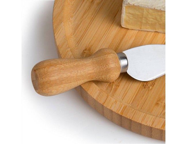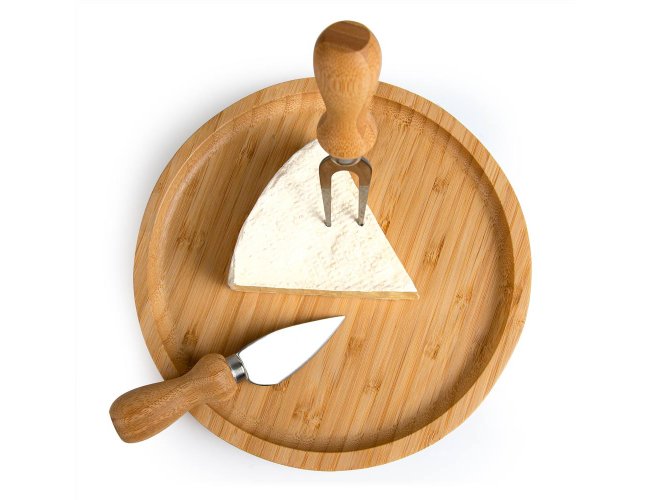 Kit para petisco / queijo. Composto por petisqueira redonda em Bambu; faca e garfo para Queijo em Madeira/Inox.