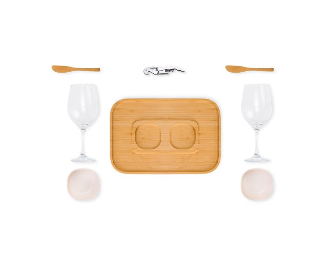 Composto por petisqueira em Bambu com duas cumbucas em Fibra de Bambu; duas espátulas de 14 cm em Bambu; duas taças em vidro para Vinho e um abridor saca-rolhas em aço Inox escovado.