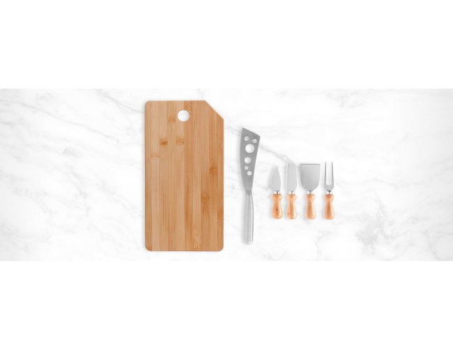 Conjunto para queijo em bambu/aço inox. Conta com tábua em bambu; Duas facas, sendo, uma com ponta e outra reta, garfo e espátula em madeira/inox; Faca para frios em metal. Acompanha embalagem kraft