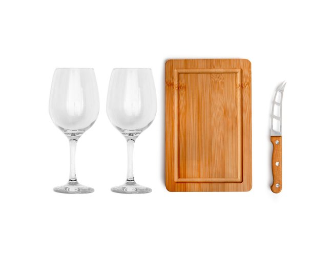 Kit Queijo e Vinho. Composto por tábua retangular para queijo em Bambu; faca 4" para queijo com cabo em Madeira/Inox e duas taças para Vinho em vidro.