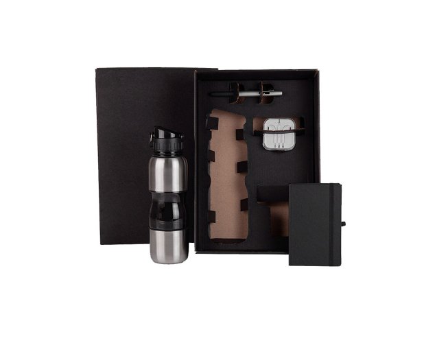 Conta com squeeze em Aço Inox 750ml; caneta em plástico ABS prata; caderno com pauta; fone de ouvido.