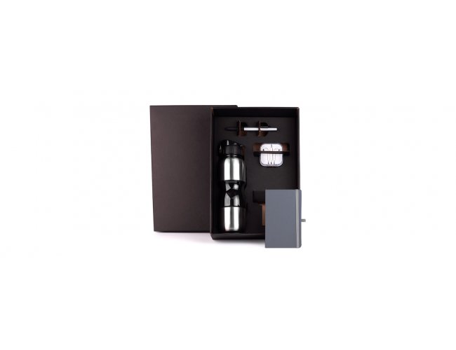 Kit squeeze e acessórios. Conta com squeeze em aço inox 750ml; fone de ouvido branco; caderno para anotações cinza com capa dura e caneta em plástico ABS prata.
